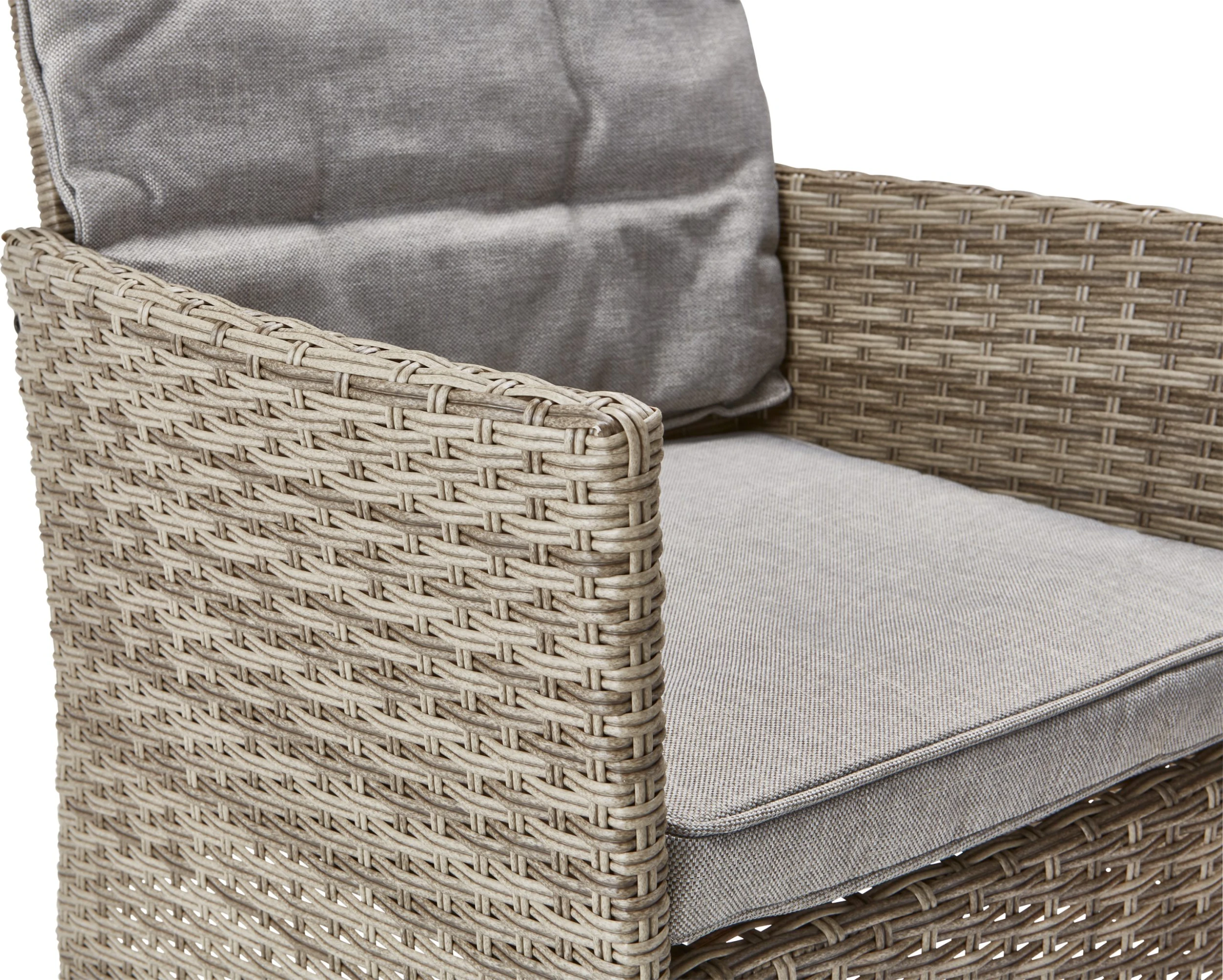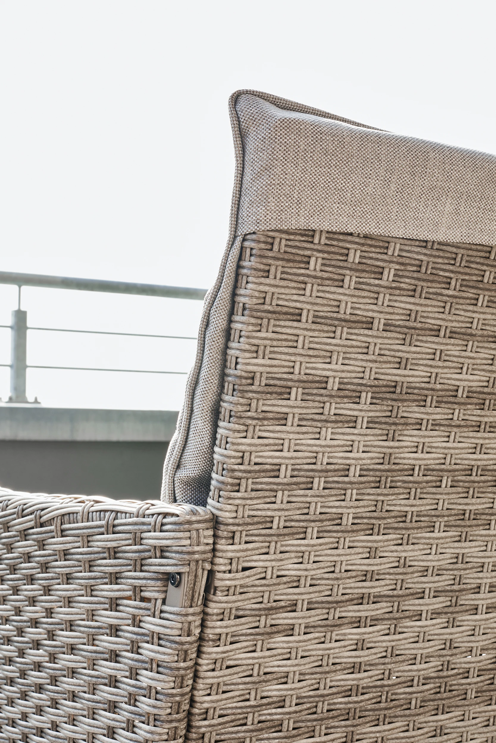 Das Set besteht aus einem witterungsbeständige Kunststoffgeflecht in der Farbe taupe. Farblich passende Sitz- und Rückenkissen bieten einen komfortablen Sitzkomfort.