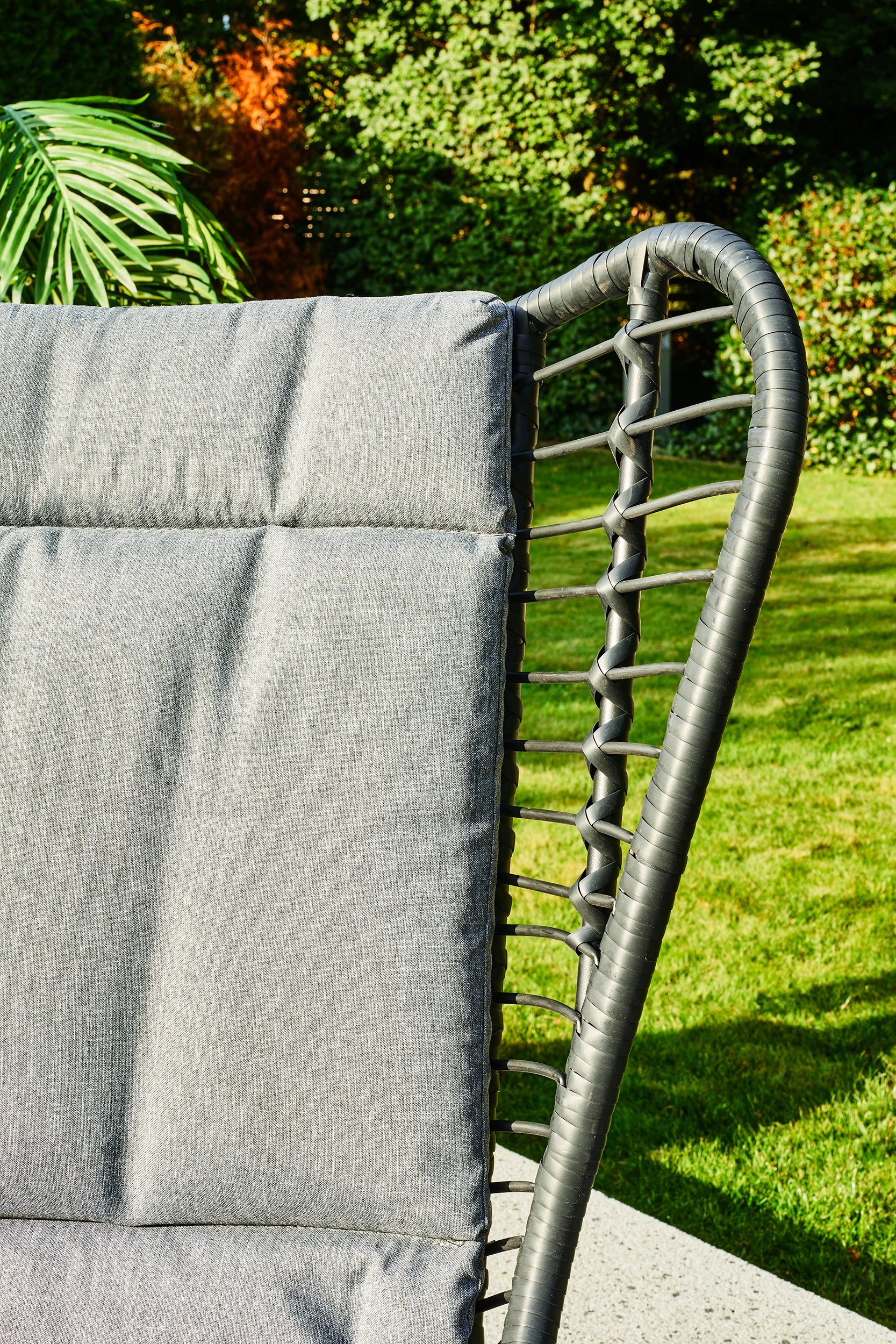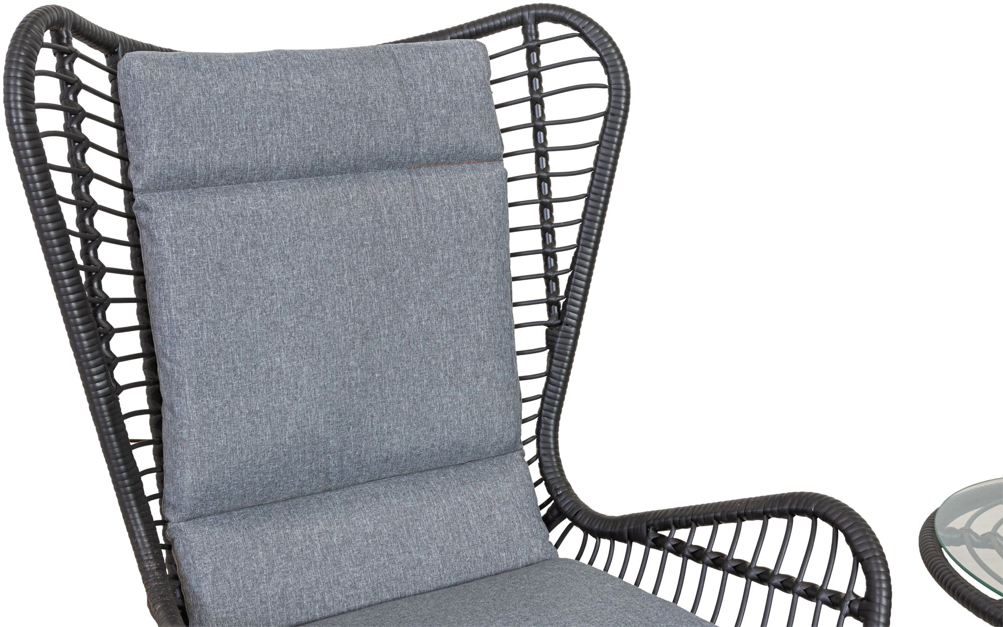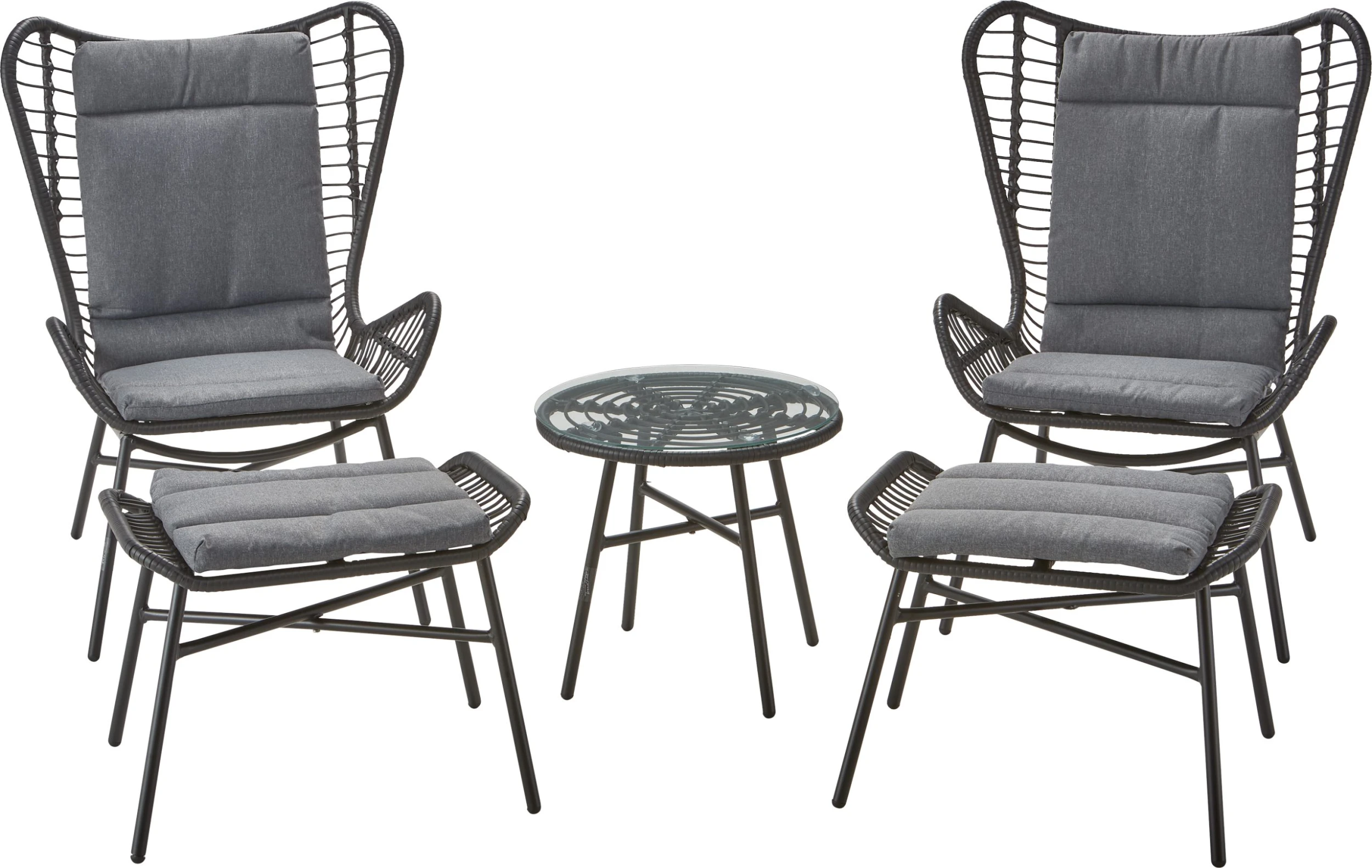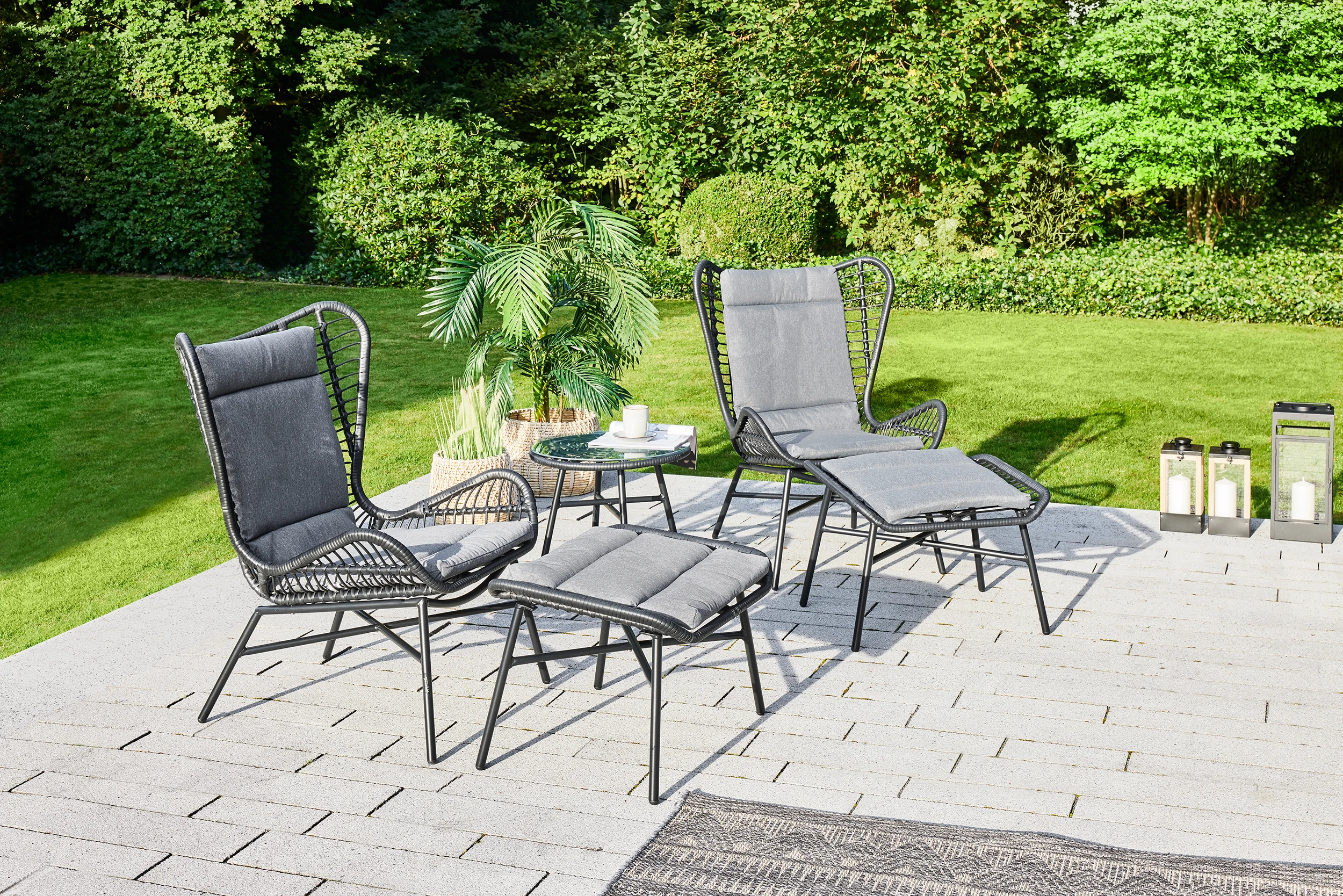 Das Balkonset Dhalia, der Marke TrendLine, bietet zwei Personen Platz für entspannte Stunden im Sommer. Die graufarbenen Sitz- und Rückauflagen, bieten hohen Sitzkomfort und zwei Fußhocker sorgen für maximale Gemütlichkeit. Ein kleiner runder Tisch macht das Set perfekt. Dieses stylische Balkonset aus schwarzes Kunstoffschnürung bringt ihnen Urlaubsfeeling nach Hause. Bestehend aus: 2 Stühlen: Maße ca. 80 x 74 cm, Höhe: ca. 101,5 cm; 2 Fußablagen: Maße ca. 60 x 52 cm, Höhe: ca. 45,5 cm; 1 Tisch: Maße ca. 50 Ø cm, Höhe: 45 cm