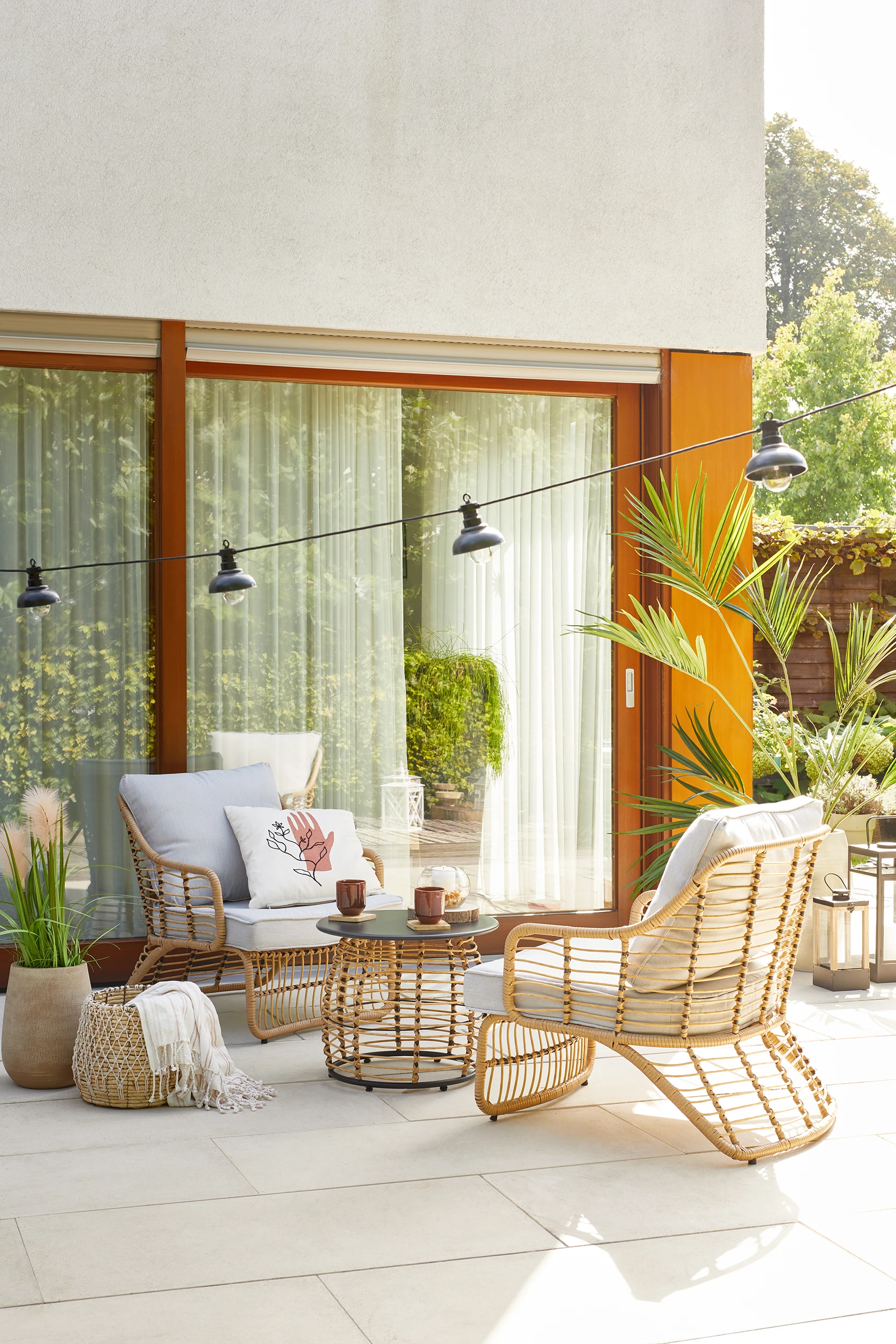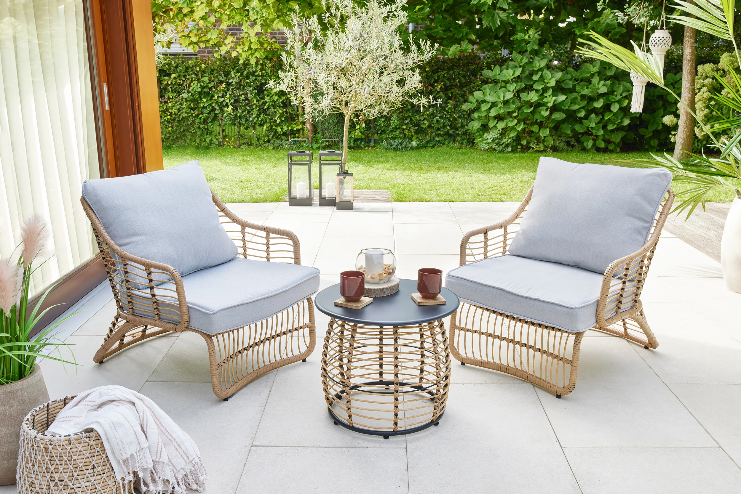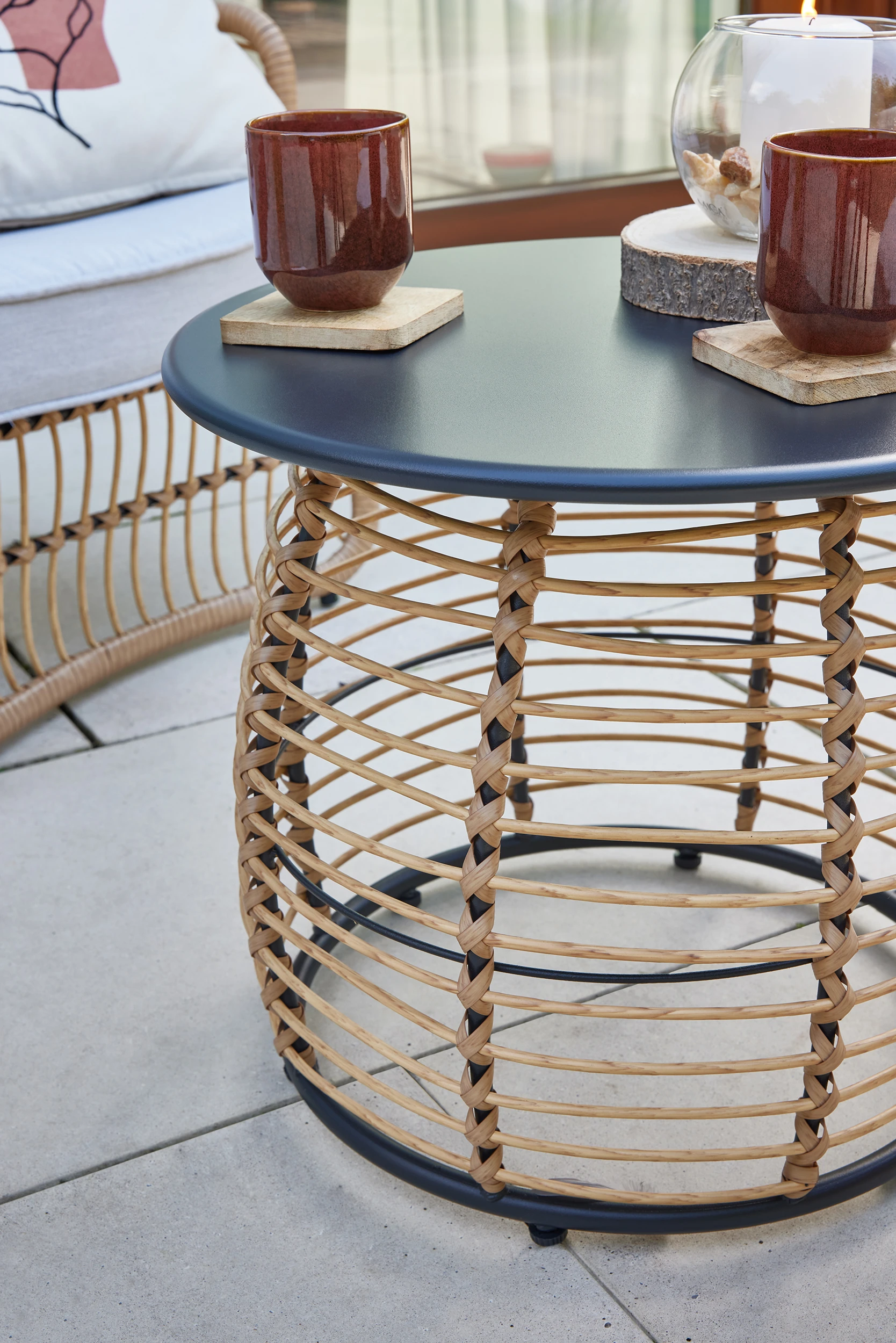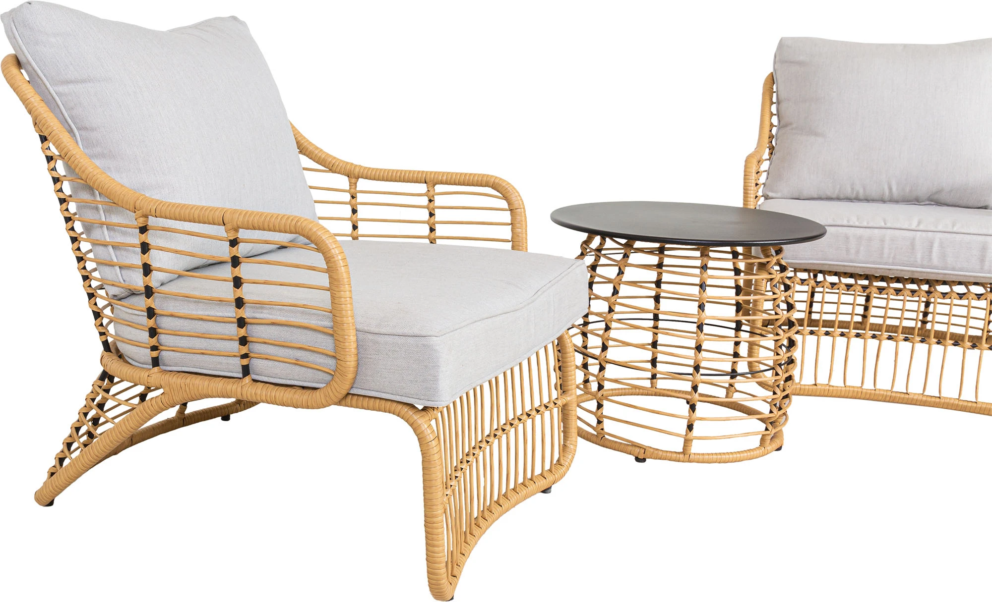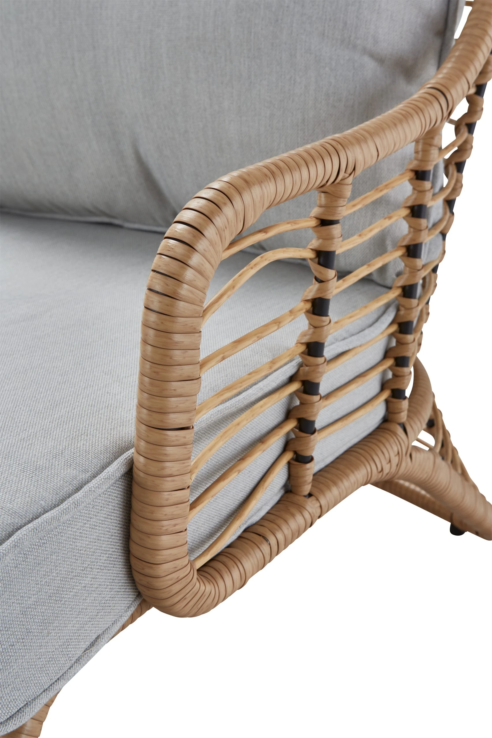 Dieses stylische Balkonset bringt Urlaubsfeeling in ihr Zuhause. Ein wahrer Eyecatcher auf jeder Terrasse oder in ihrem Wintergarten. Das witterungsbeständige Korbgeflecht, ein kleiner runder Tisch und die bequemen Auflagen in grau machen dieses moderne Set perfekt.