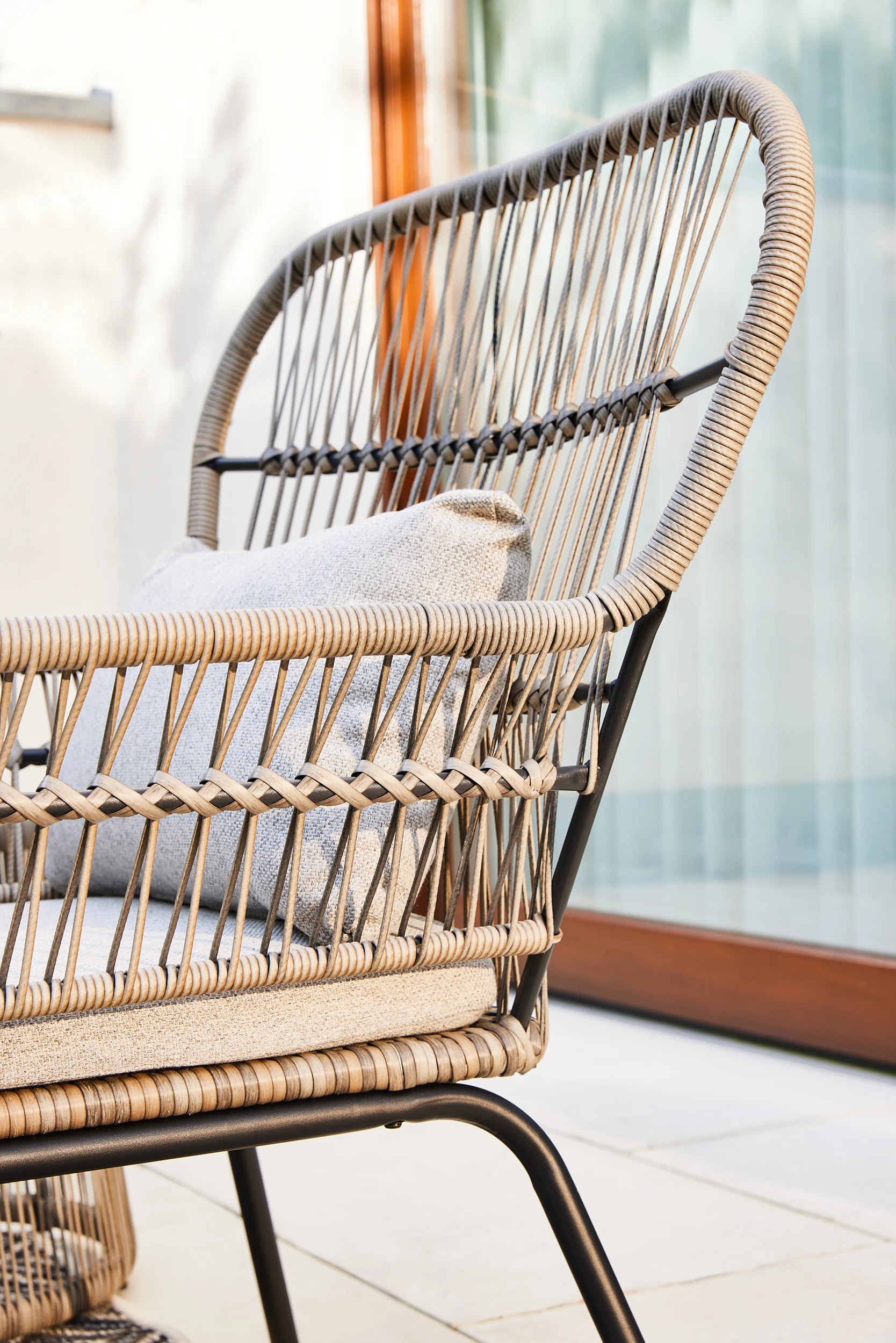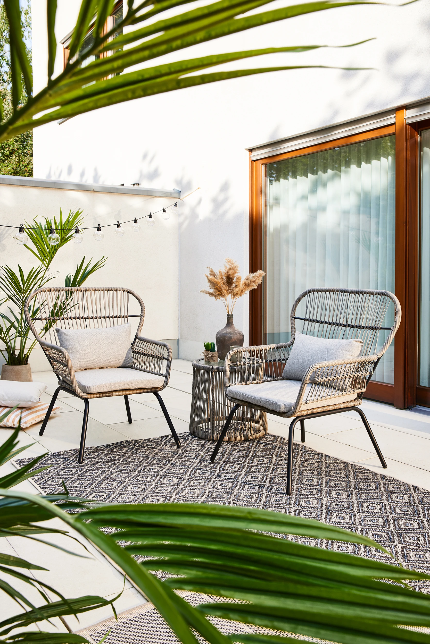 Dieses formschöne Balkonset bietet eine tollen Flair und angenehmen Komfort auf ihrer Terrasse oder ihrem Wohnraum. Genießen Sie den Sommer mit dieser platzsparenden Garnitur aus einem witterungsbeständigen Kunststoffgeflecht . Die farblich abgestimmten Sitz und Rückenkissen bieten einen angenehmen Sitzkomfort.