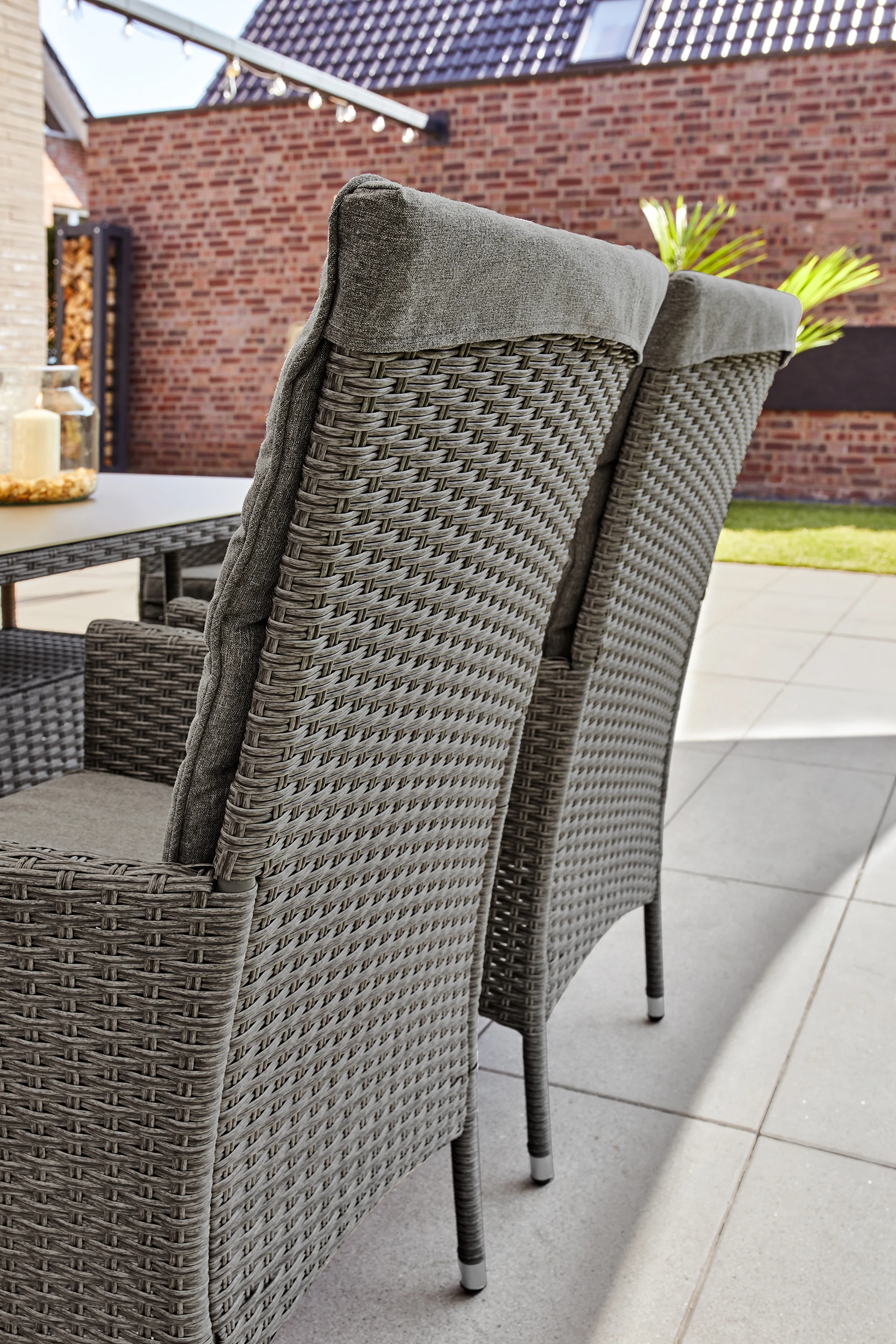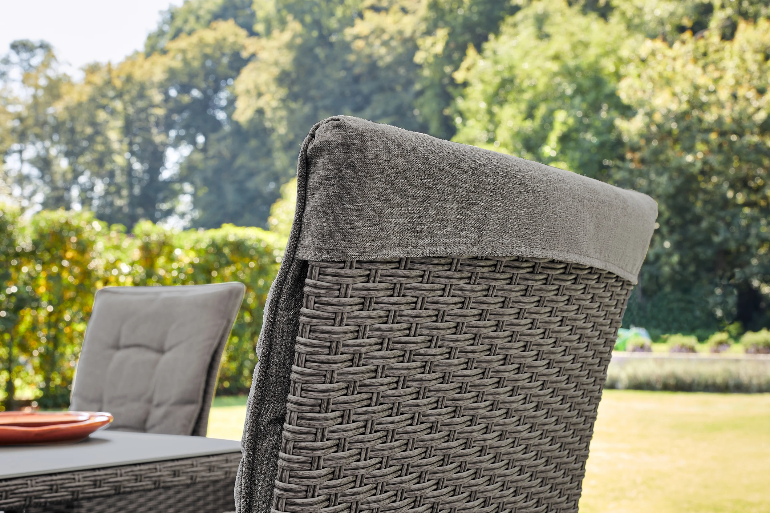 Diese Esstischgarnitur Bergamo, der Marke TrendLine, lädt zum gemütlichen Beisammensein auf ihrer Terrasse oder in ihrem Winter-Garten ein. Die bequemen Stühle mit den farblich passende Sitz- und Rückenkissen bieten ihnen einen angenehmen Sitzkomfort. Das Kunststoffgeflecht in der Farbe Atomic Grey ist witterungsbeständig und pflegeleicht. Genießen sie einzigartigen Wohnkomfort unter freiem Himmel. Das Set besteht aus: 1 Tisch 150 x 80 cm Höhe: 72 cm, 6 Stühle je 60 x 59 x 100 cm inkl. Sitz- und Rückenkissen