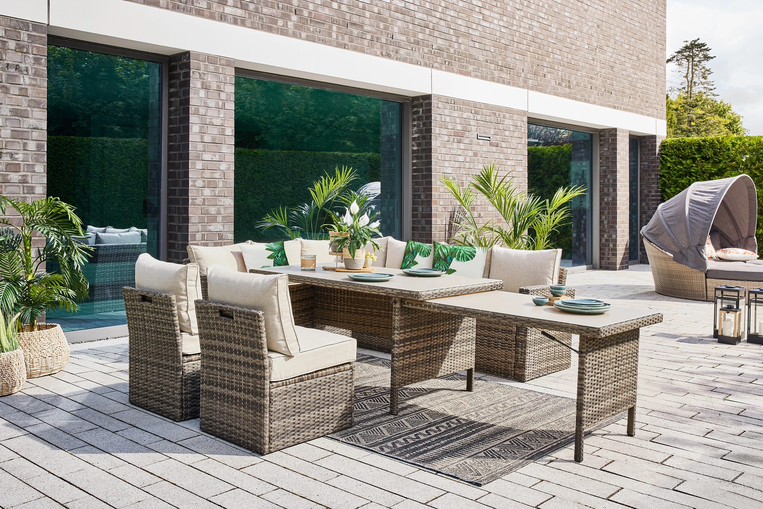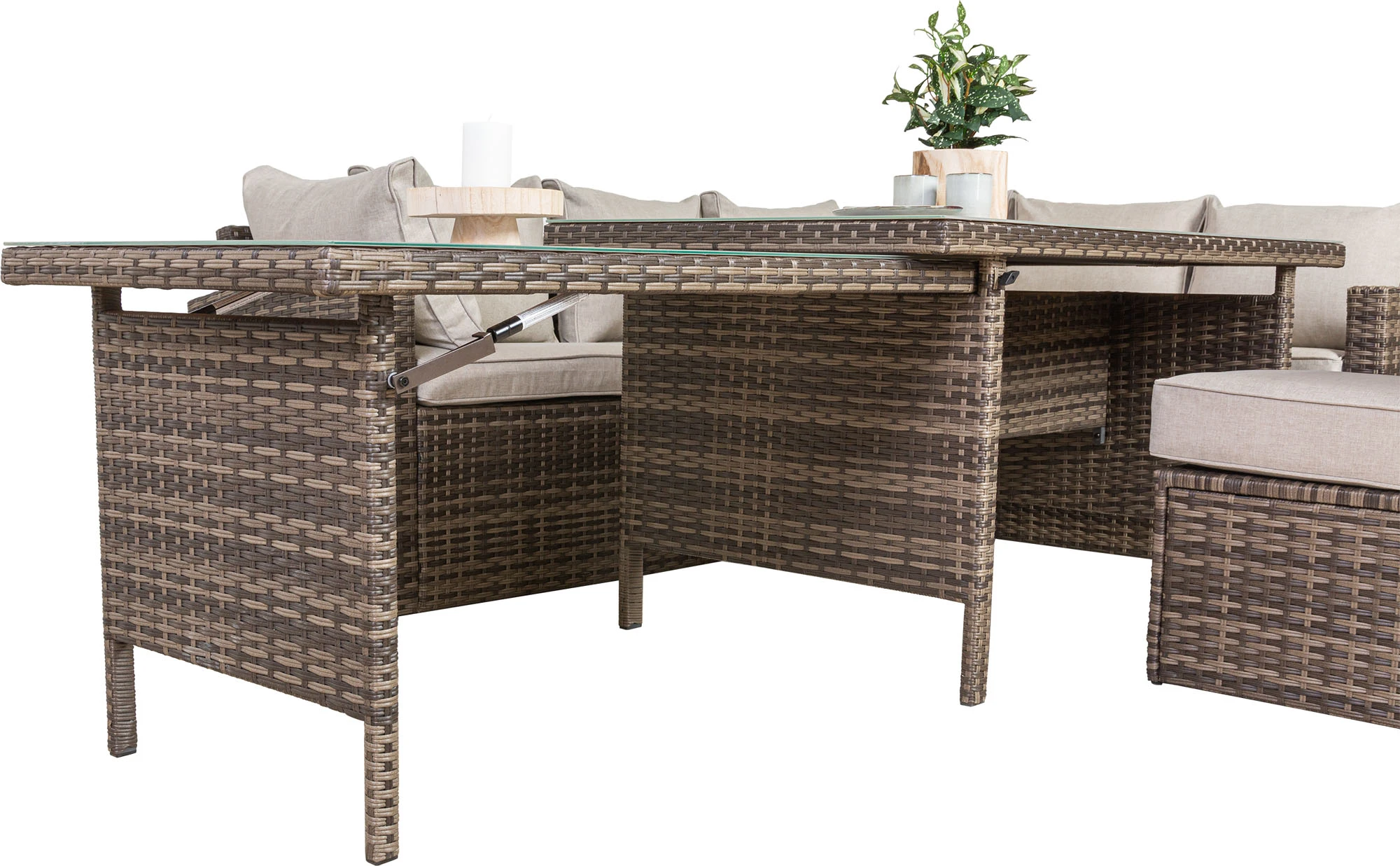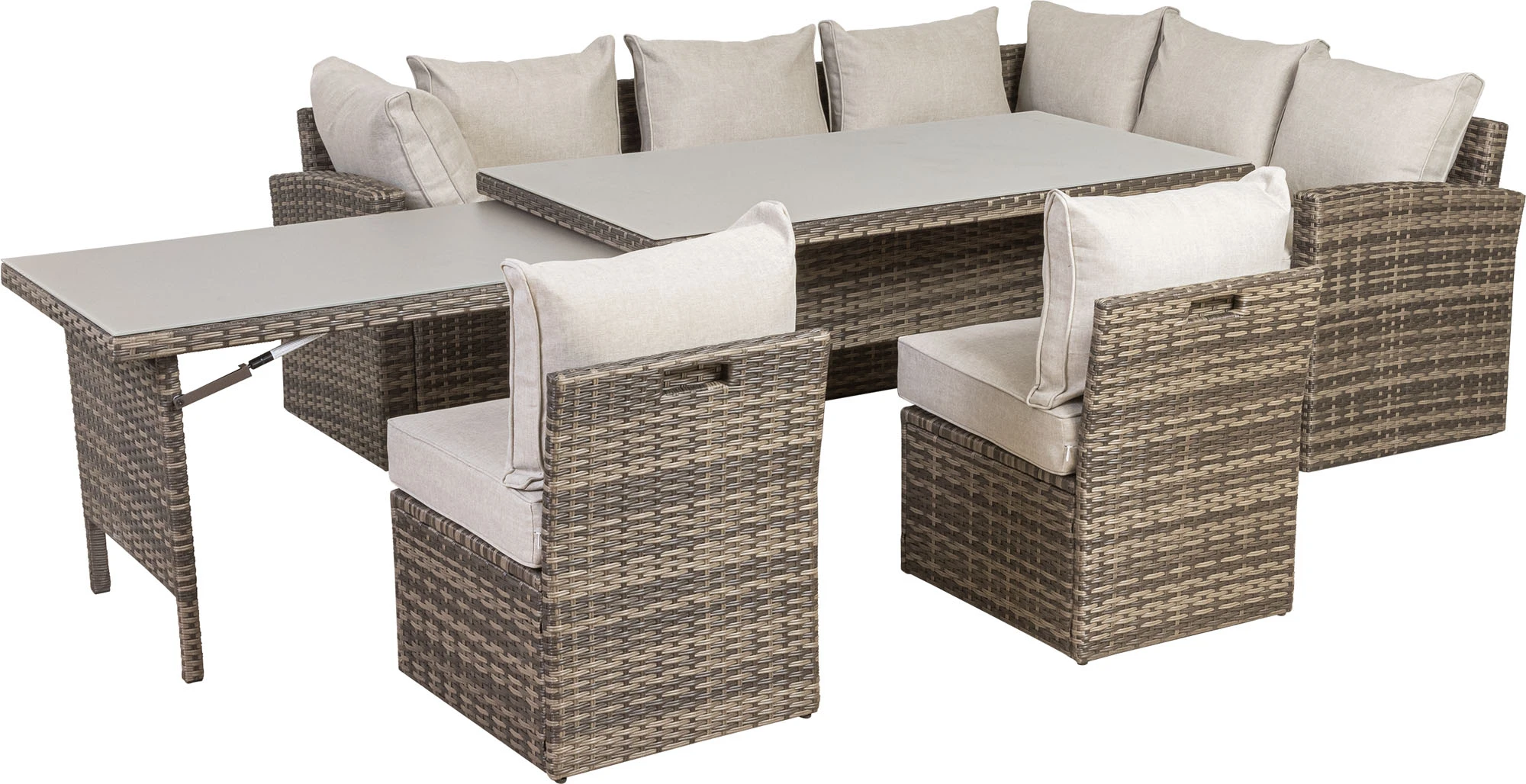 Die angenehme Sitzhöhe dieser Garnitur ermöglicht Ihnen bequemes und komfortables Sitzen und lädt Sie anschließend zum Entspannen ein. Die Garnitur aus braunem Kunststoffgeflecht mit farblich abgestimmten Rücken- und Sitzkissen lässt keine Wünsche offen. Genießen Sie wohnlichen Komfort auf Ihrer Terrasse. Nicht nur optisch überzeugt die Dining Lounge Gruppe Avila. Durch die “hidden chairs” Konstruktion können aus dem Rücken der Sitzbank zwei Sitzelemente gezogen werden, mit welchen Sie die Lounge in der Länge erweitern oder diese als Sitzelemente nutzen können. Hinzu kommt noch die Ausziehtischfunktion. Durch eine Gasdruckfunktion kann aus dem Haupttisch ein weiterer Tisch herausgezogen werden. Sie können somit den Haupttisch von ca. 145 x 85 x 67 cm noch einmal um einen kleineren Tisch von 105 x 72 x 63 cm erweitern. Die aufliegenden Strukturglasplatten sind besonders pflegeleicht.