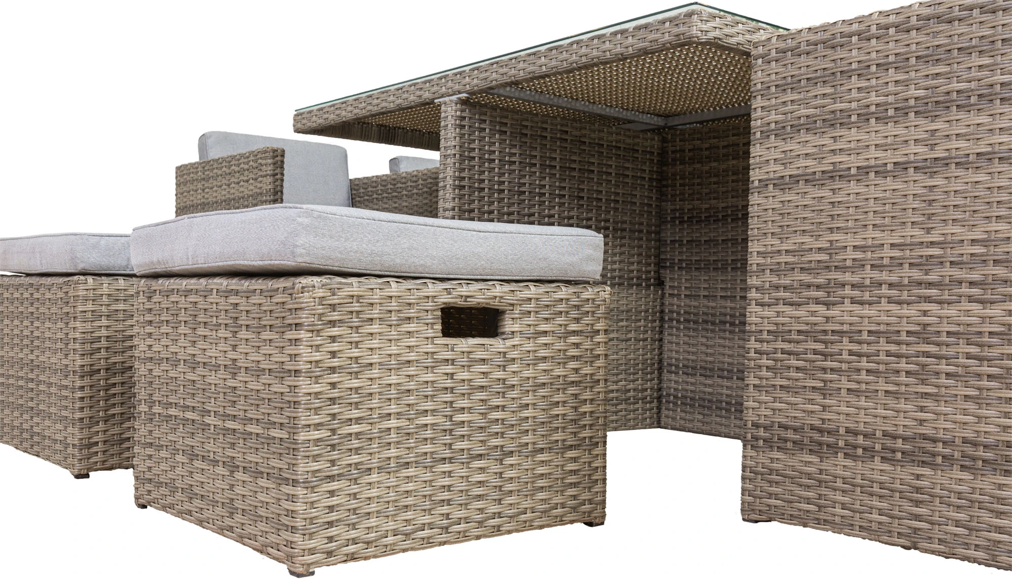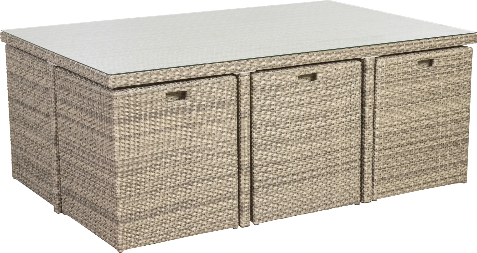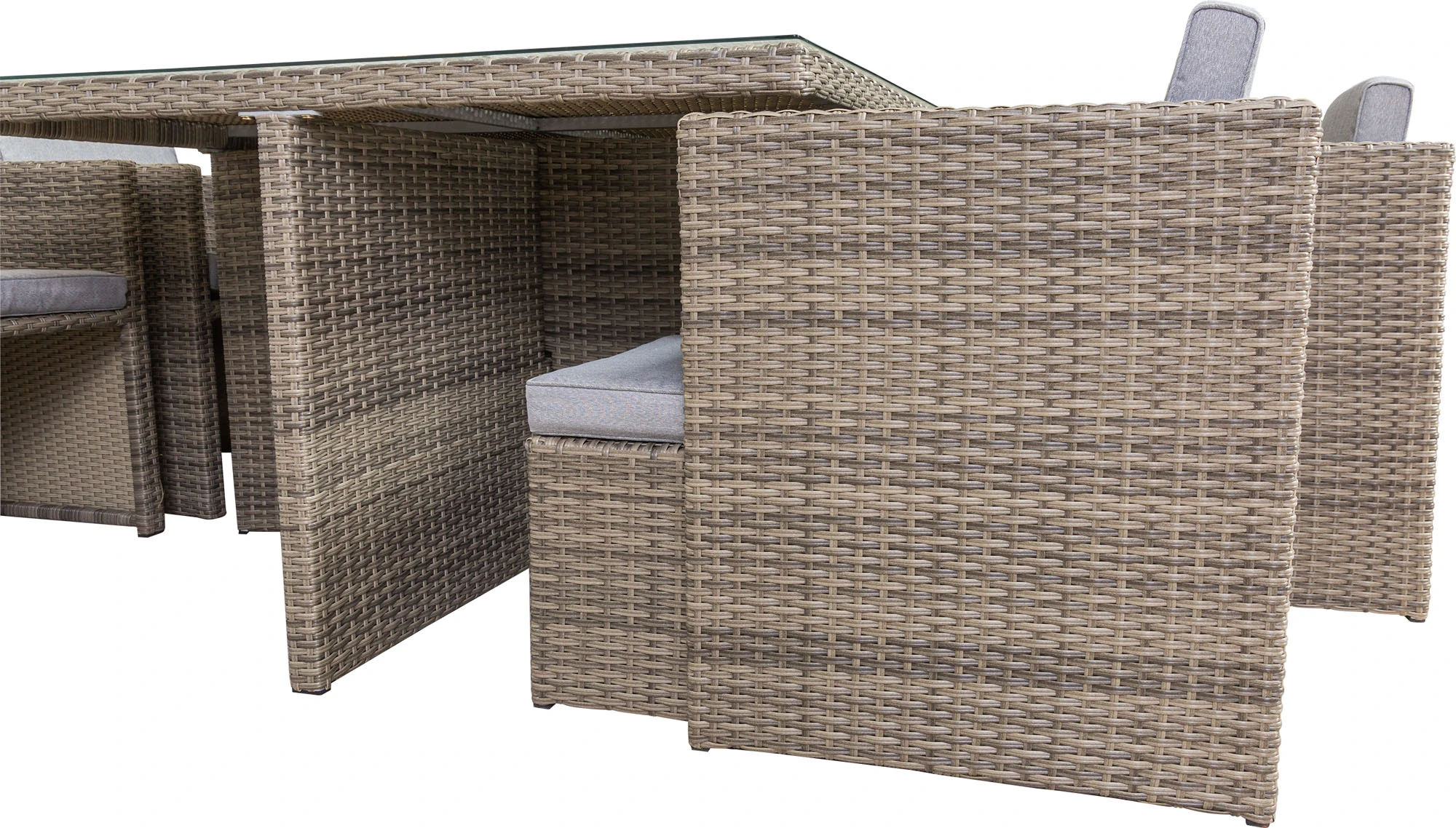 Diese Sitzgruppe bietet viel Platz für Freunde und Familie. Eine elegante Verarbeitung in der Farbe grau, sowie farblich passende Sitzauflagen sorgen für einen angenehmen Sitzkomfort. Besonders praktisch ist das geringe Aufstellmaß, wenn alle Elemente ineinander gestellt sind. Das witterungsbeständige Kunststoffgeflecht ist besonders pflegeleicht. Ein formschönes Möbelset für ihr Zuhause, ob drinnen oder draußen.