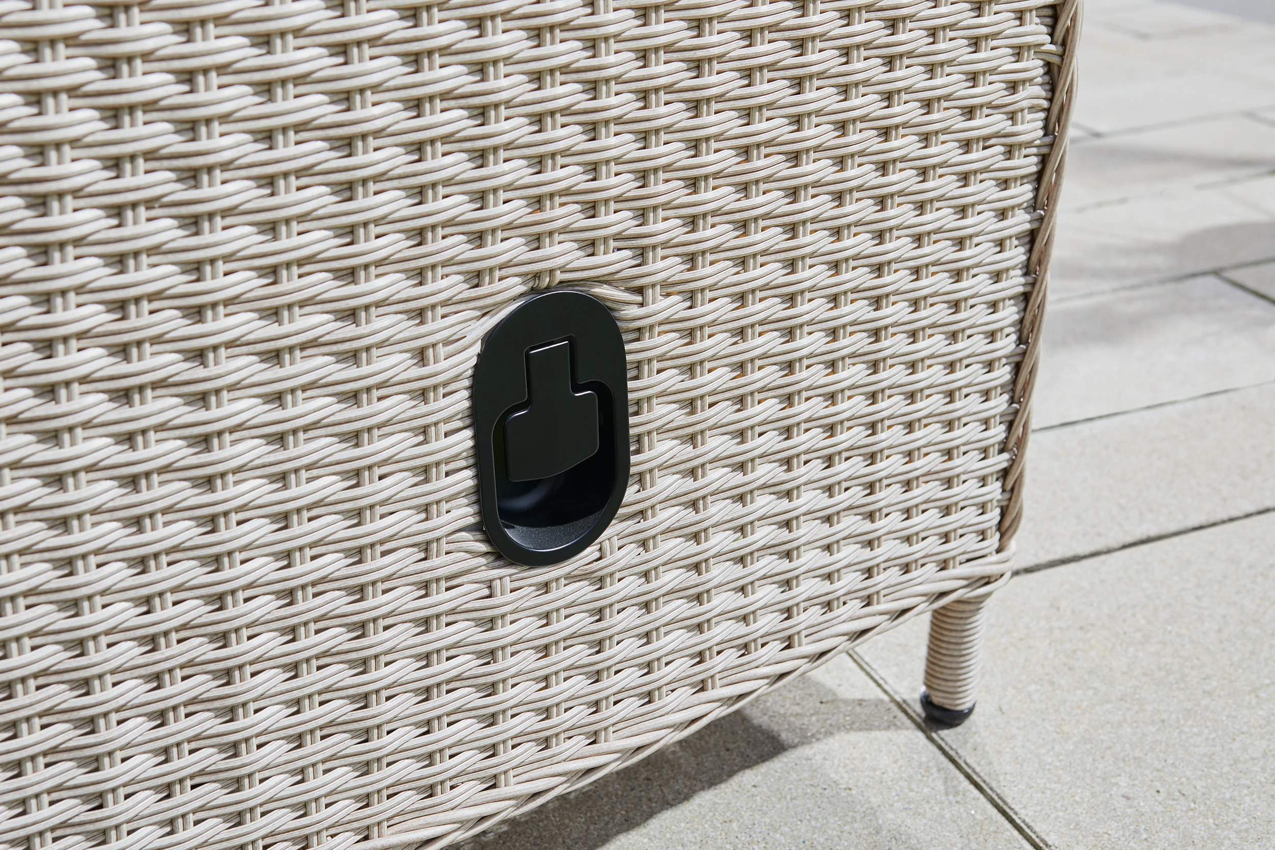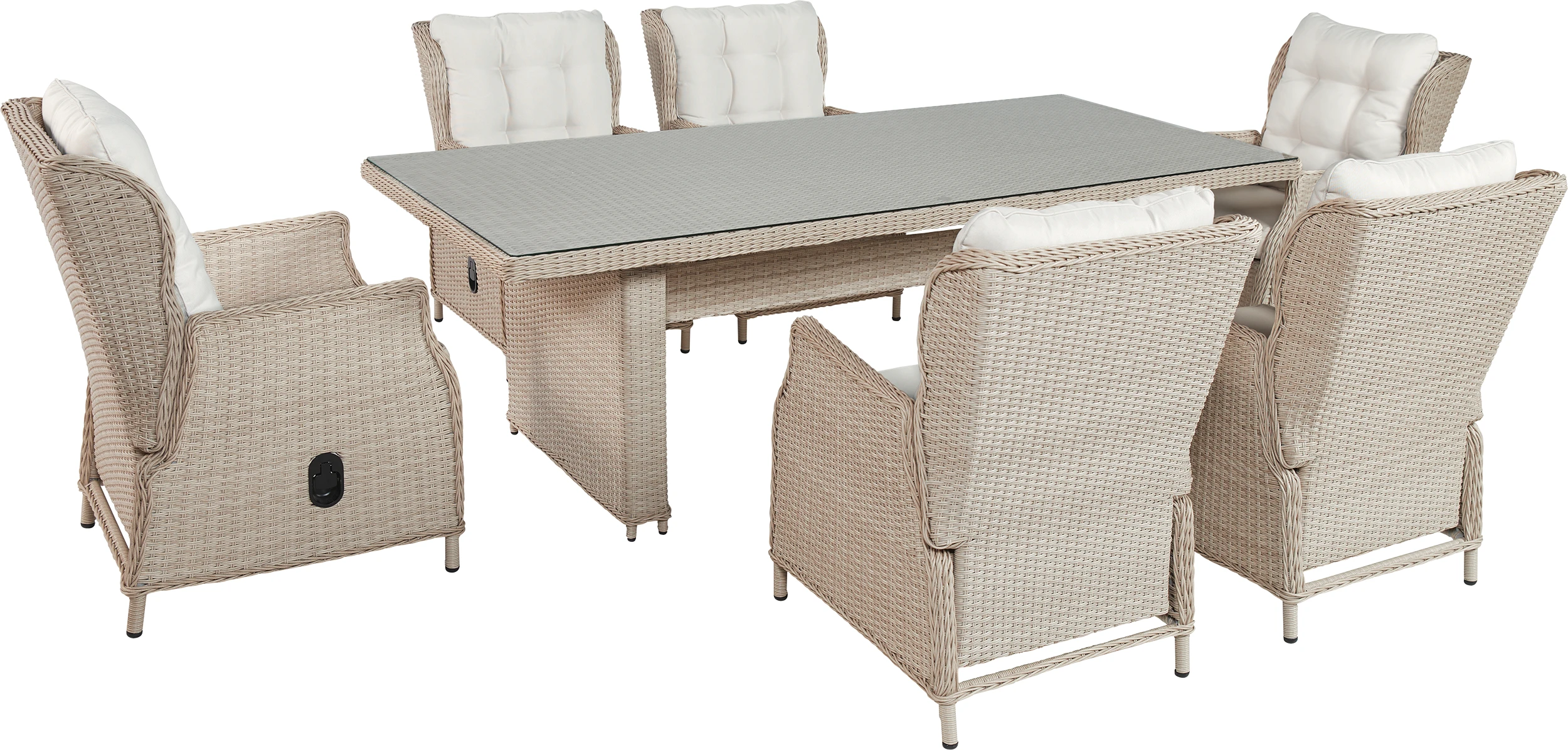 Machen Sie ihr gemütliches Beisammensein und ihre Mahlzeiten unter freiem Himmel zu einem besonderen Erlebnis. Die Sessel mit hohen Rückenlehnen sind nicht nur extra bequem, sie lassen sich dank der Hydraulik mit einem Handgriff stufenlos in die gewünschte Position bringen. Das gesamte Set ist aus hochwertigen Materialien gefertigt und besticht durch sein hochwertiges und witterungsbeständigem Kunststoffgeflecht in der Farbe beige. Die gemütlichen Polster bieten höchsten Sitzkomfort. Ob zum Speisen, Ausruhen oder auch Arbeiten mit dieser Garnitur der Marke Trendline wird alles zum Genuss.