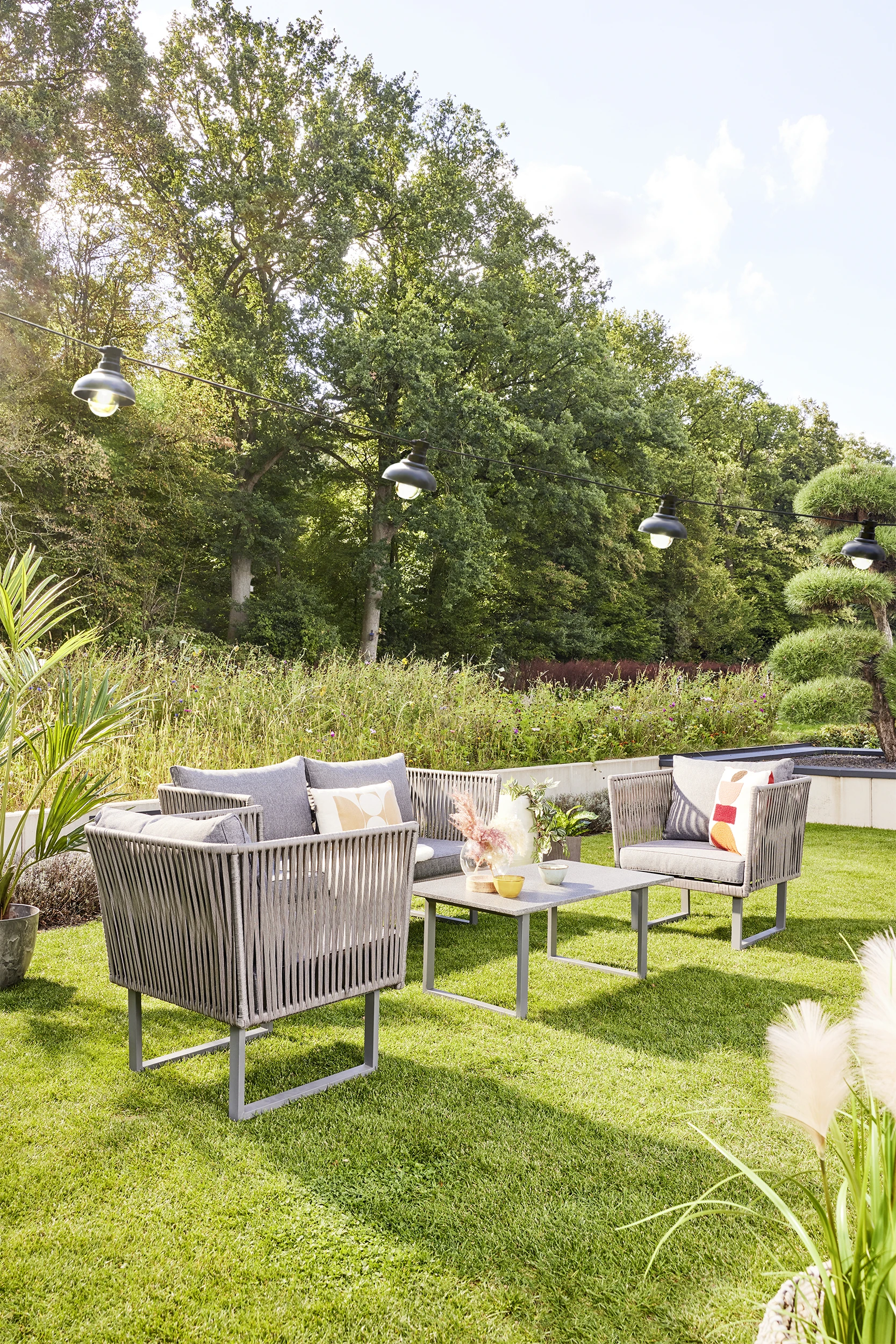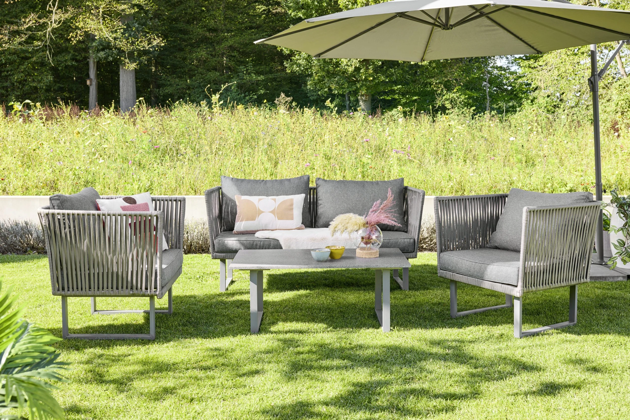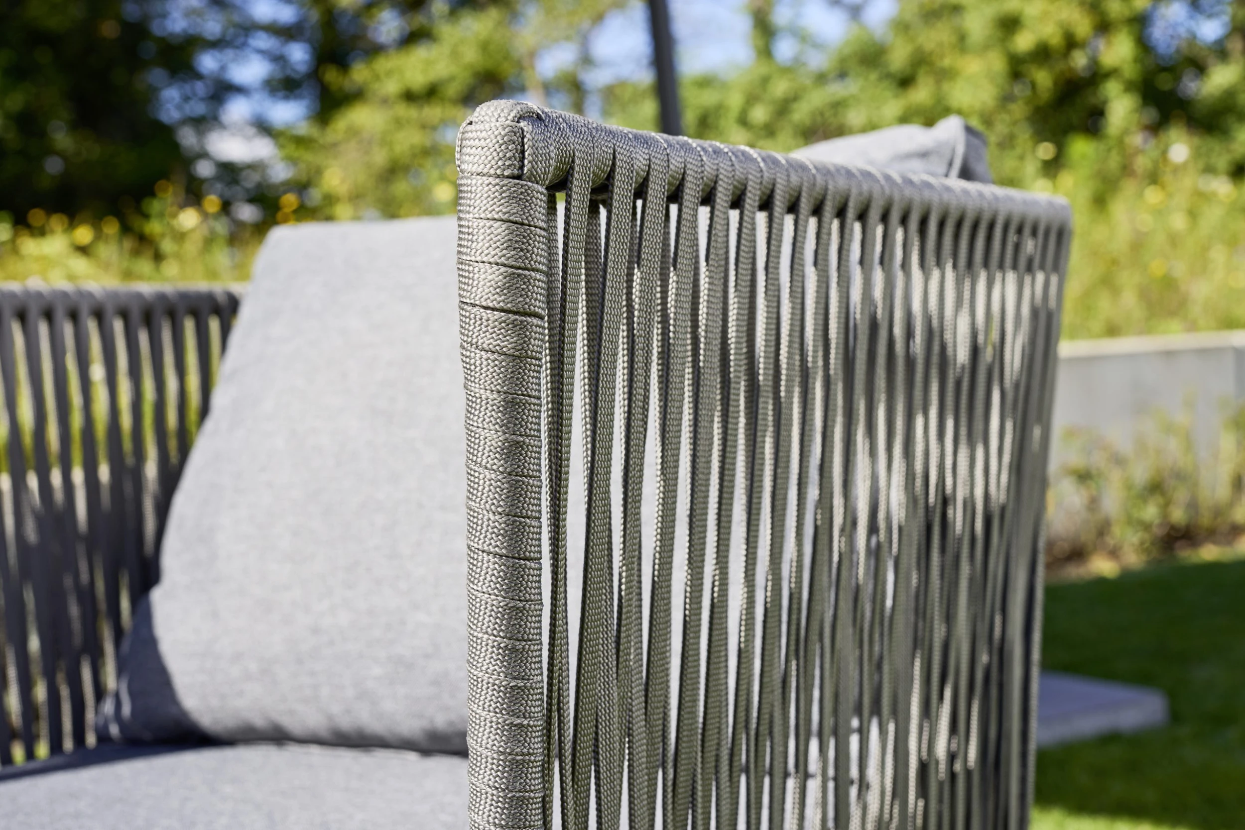 Dieses Sofa- Set ist eine wahrer Blickfang auf ihrer Terrasse. Das modere Seilgeflecht aus witterungsbeständigem Kunststoff ist optisch sehr ansprechend und verleiht der Garnitur einen besonderen Akzent. Die bequemen und farblich passenden, Sitz und Rückenpolster, bieten einen hohen Sitzkomfort und laden zum gemütlichen Entspannen ein.