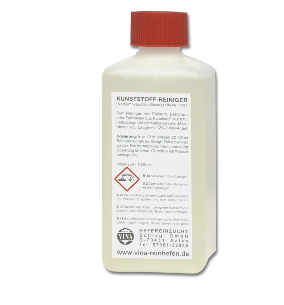Zum Reinigen von FĂ€ssern, BehĂ€ltern oder Formteilen aus Kunststoff. Auch fĂŒr hartnĂ€ckige Verschmutzungen wie MostrĂ€nder. Lauge und Chlor-Anteil. Mit Wasser verdĂŒnnen.
