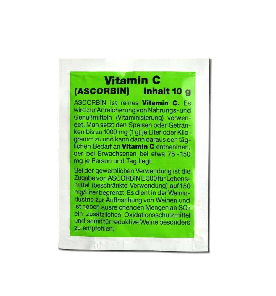 Durch die Zugabe von reinem Vitamin C in Säften oder Weinen sichert man sich leicht den täglichen Bedarf an Vitamin C. Wirkt auch reduktiv auf den Sauerstoff, so dass eine reduzierte Schwefelung der Weine möglich ist.