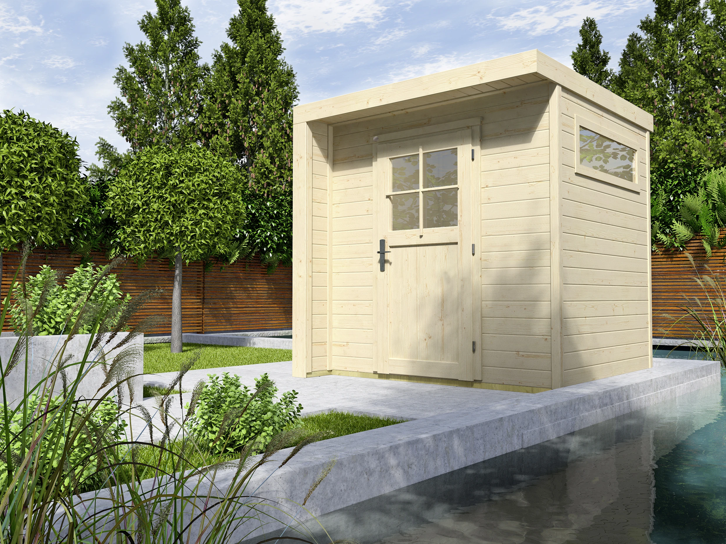 Das Designhaus Rabea fügt sich mit seiner kubischen Form in den modernen Garten harmonisch ein. Die Breite beträgt 209 cm und die Tiefe 205 cm. Für optimale Stabilität sorgen 21 mm dicke Wandblockbohlen, ein 16 mm dicker Massivholzboden und das 16 mm starke Massivholz-Flachdach. Funktionalität und Sicherheit bieten die hochwertige Drückergarnitur inklusive Profilzylinderschloss. Für mehr Licht im Innenraum empfehlen wir das schmale Seitenfenster – (optional erhältlich). Nicht nur funktional und praktisch, sondern zum Verstauen und Aufräumen bestens geeignet, ist das Designhaus Rabea.