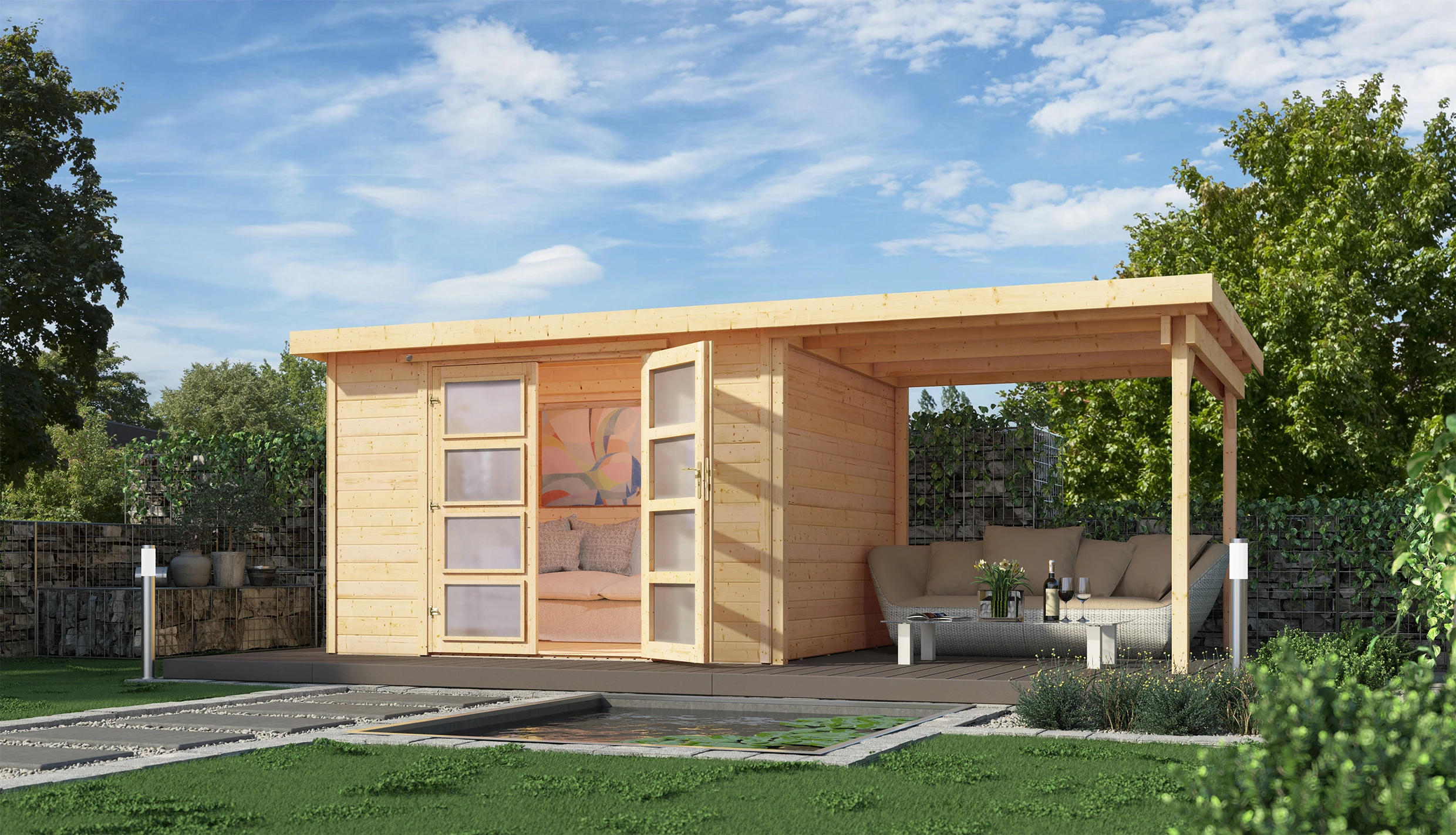 Gartenhaus Arvid B Gr.3 überzeugt durch seine moderne, zeitlose Optik mit Flachdach. Die Breite beträgt 254 cm und die Tiefe 250 cm mit 242 cm Anbau. 19 mm starke Wandblockbohlen, der 16 mm dicke Massivholzboden und das 16 mm starke Massivholzdach sorgen für optimale Stabilität. Hohe Funktionalität und eine schöne Optik bekommt das Haus durch die breite Massivholz-Panoramadoppeltür mit Milchglaselementen. Die hochwertige Griffgarnitur mit Profilzylinderschloss bieten Sicherheit. Dieses Gartenhaus ist individuell nutzbar für Gartenutensilien oder Fahrräder und bleibt dank seiner zeitlosen Optik immer top aktuell.