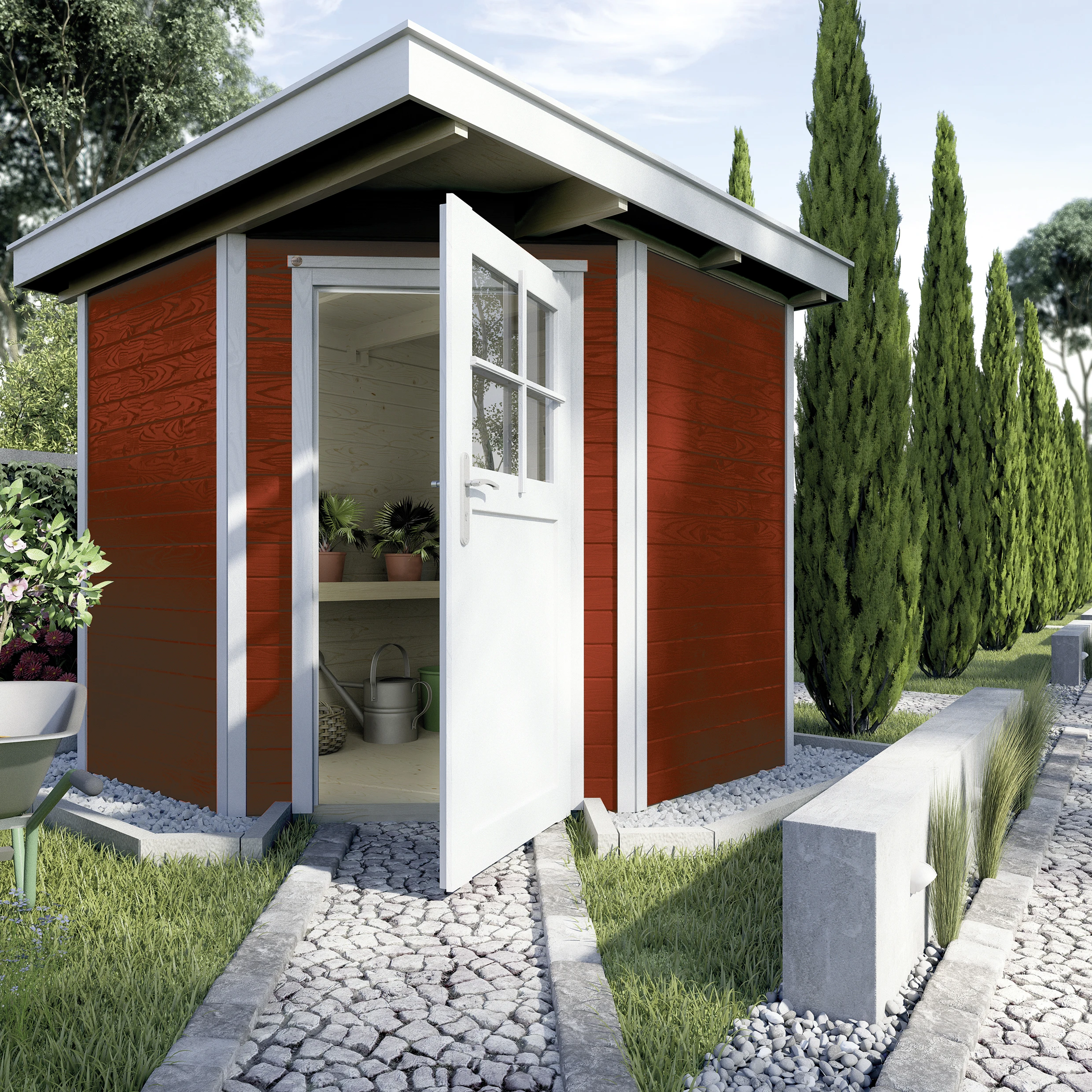 Gartenhaus Nantje Gr.1 ist dank seiner ausgefallenen 5-Eck-Bauweise ein echtes Raumwunder. Für optimale Stabilität sorgen 21 mm dicke Wandblockbohlen, 16 mm dicker Massivholzboden und ein 16 mm starkes Massivholz-Flachdach. Die Weka-Qualität zeichnet sich durch bestes, von außen in der Wetterschutzfarbe Schwedenrot lasiertem Fichtenholz aus und sorgt für eine lange Lebensdauer. Auf Grund der besonderen Bauweise und einer platzsparenden hochwertigen Ecktür bietet das Haus viel Stauraum bei geringem Platzbedarf. Nutzen Sie jeden Winkel Ihres Gartens optimal mit unserer praktischen Ecklösung.