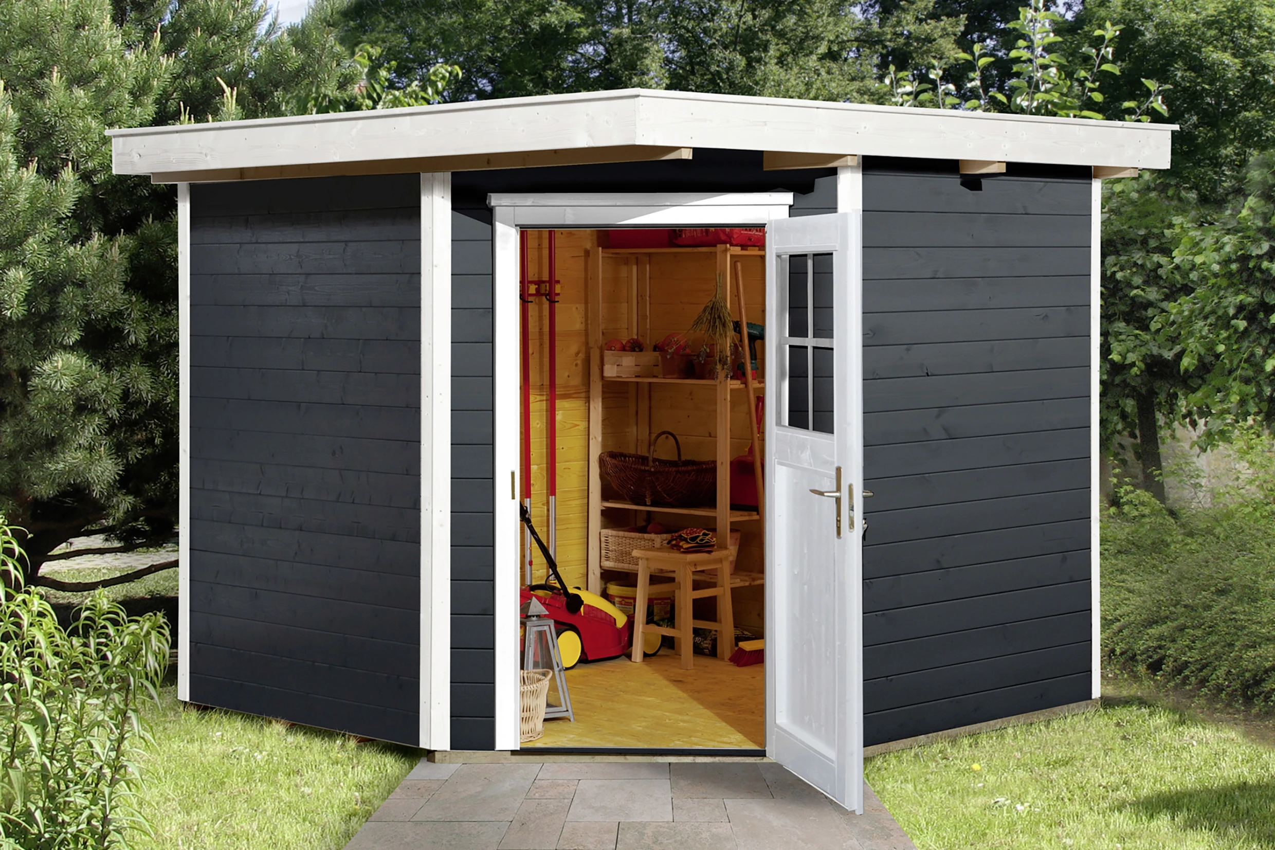 Gartenhaus Nantje Gr.2 ist dank seiner ausgefallenen 5-Eck-Bauweise ein echtes Raumwunder. Für optimale Stabilität sorgen 21 mm dicke Wandblockbohlen, 16 mm dicker Massivholzboden und ein 16 mm starkes Massivholz-Flachdach. Die Weka-Qualität zeichnet sich durch bestes, von außen in der Wetterschutzfarbe Anthrazit lasiertem Fichtenholz aus und sorgt für eine lange Lebensdauer. Auf Grund der besonderen Bauweise und einer platzsparenden hochwertigen Ecktür bietet das Haus viel Stauraum bei geringem Platzbedarf. Nutzen Sie jeden Winkel Ihres Gartens optimal mit unserer praktischen Ecklösung.