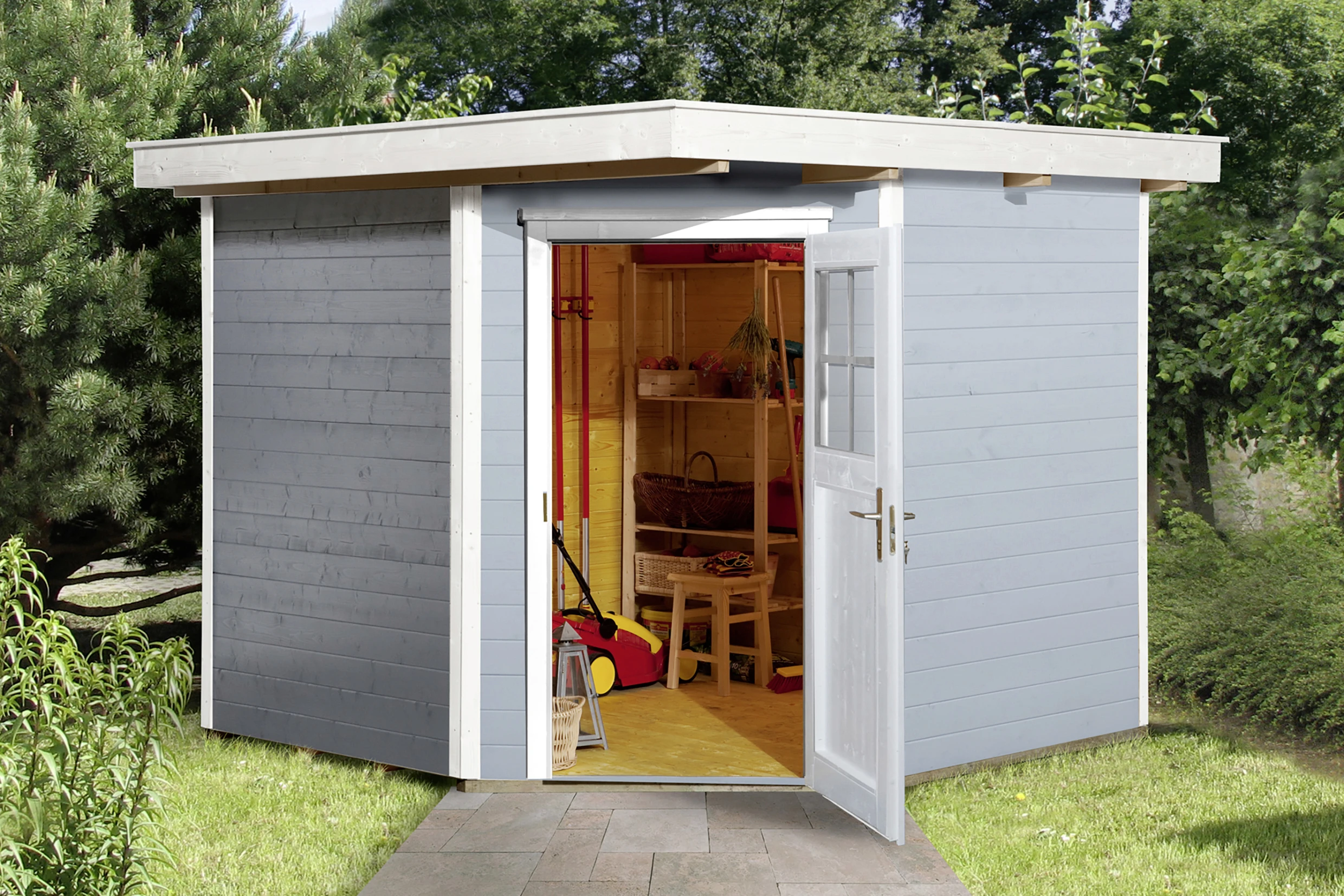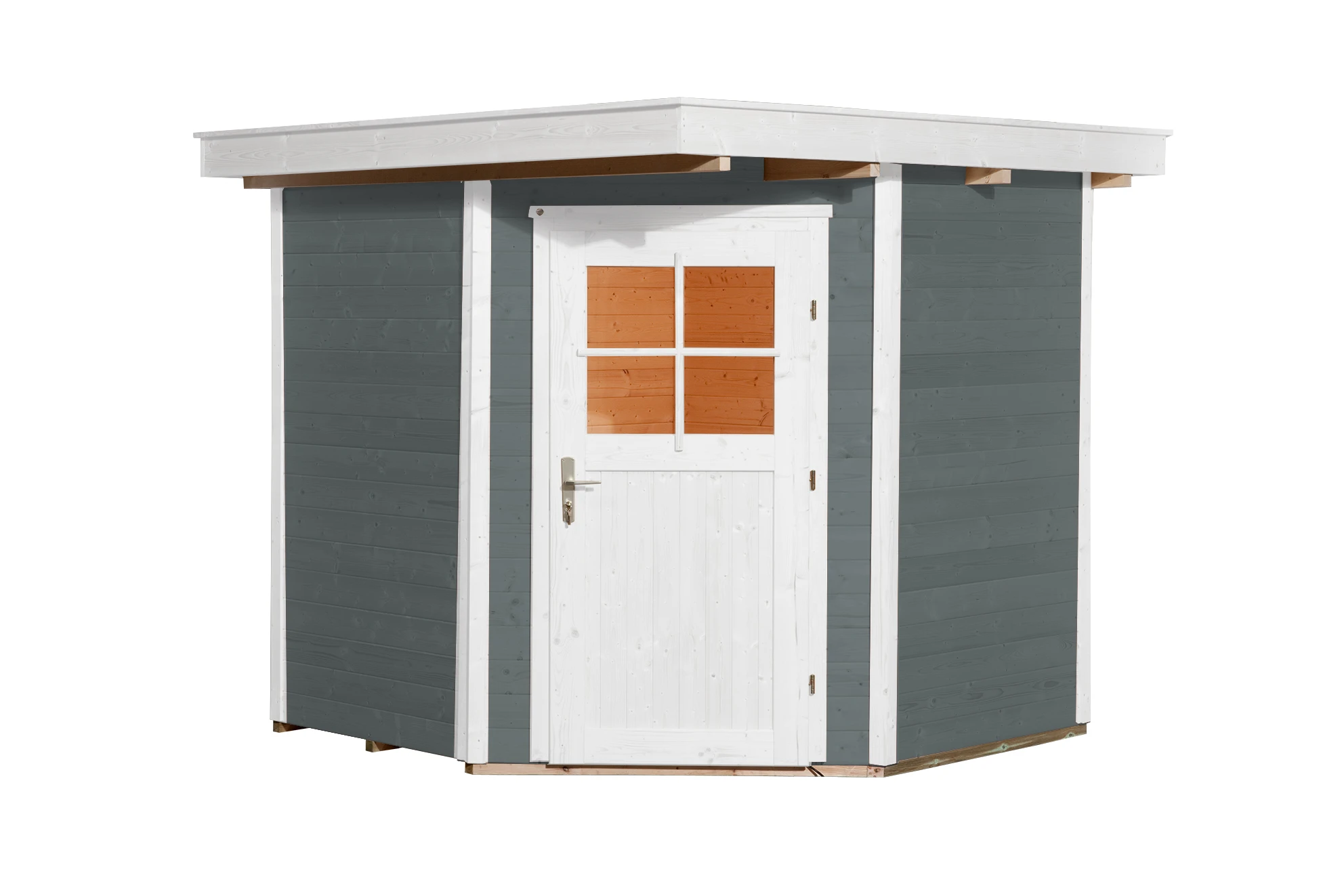 Gartenhaus Nantje Gr.2 ist dank seiner ausgefallenen 5-Eck-Bauweise ein echtes Raumwunder. Für optimale Stabilität sorgen 21 mm dicke Wandblockbohlen, 16 mm dicker Massivholzboden und ein 16 mm starkes Massivholz-Flachdach. Die Weka-Qualität zeichnet sich durch bestes, von außen in der Wetterschutzfarbe Grau lasiertem Fichtenholz aus und sorgt für eine lange Lebensdauer. Auf Grund der besonderen Bauweise und einer platzsparenden hochwertigen Ecktür bietet das Haus viel Stauraum bei geringem Platzbedarf. Nutzen Sie jeden Winkel Ihres Gartens optimal mit unserer praktischen Ecklösung.