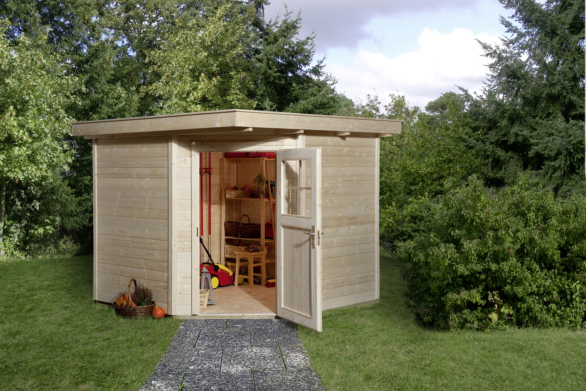 Gartenhaus Nantje Gr.2 ist dank seiner ausgefallenen 5-Eck-Bauweise ein echtes Raumwunder. Für optimale Stabilität sorgen 21 mm dicke Wandblockbohlen, 16 mm dicker Massivholzboden und ein 16 mm starkes Massivholz-Flachdach. Die Weka-Qualität zeichnet sich durch bestes naturbelassenes Fichtenholz aus und sorgt für eine lange Lebensdauer. Auf Grund der besonderen Bauweise und einer platzsparenden hochwertigen Ecktür bietet das Haus viel Stauraum bei geringem Platzbedarf. Nutzen Sie jeden Winkel Ihres Gartens optimal mit unserer praktischen Ecklösung.