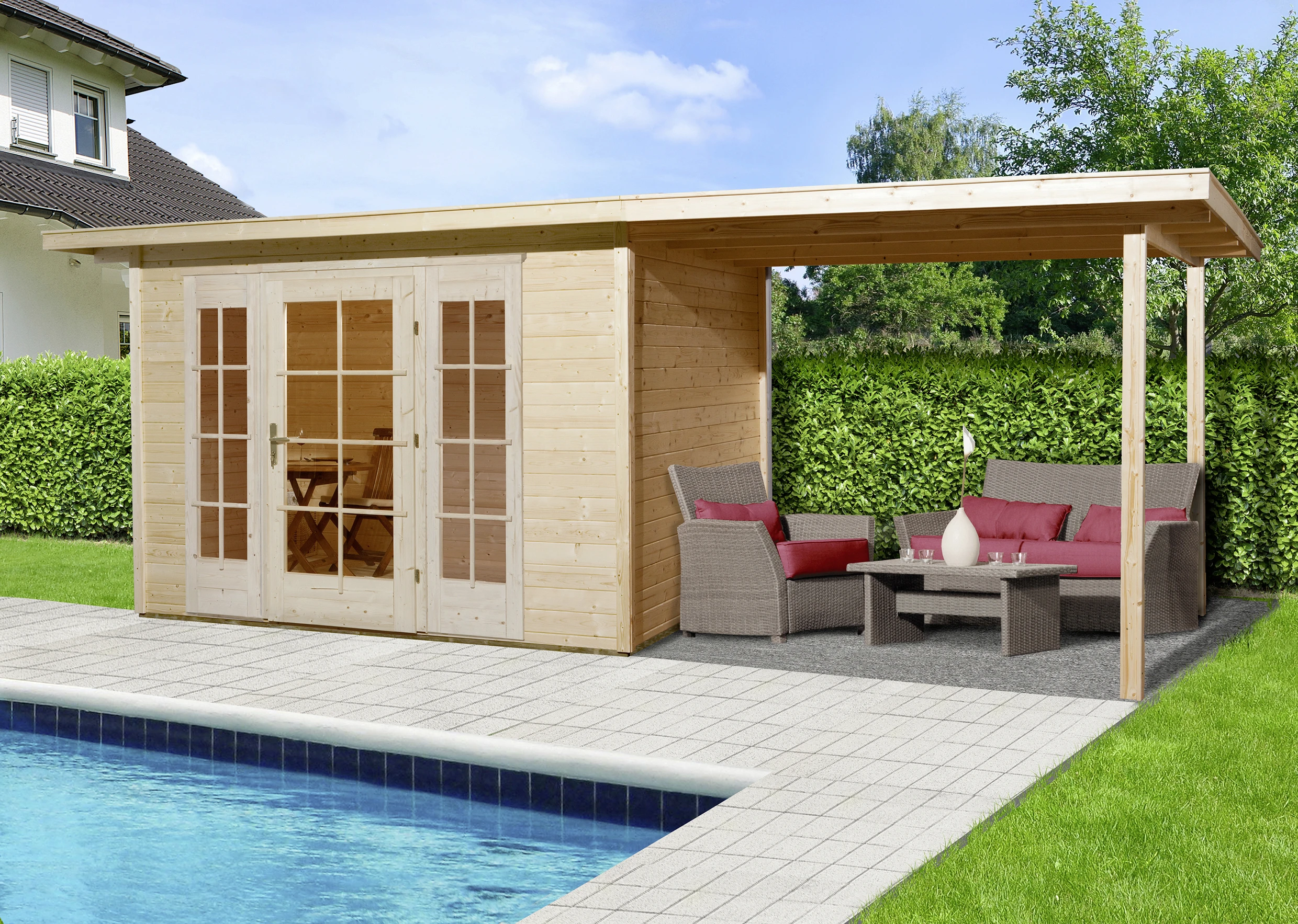 Gartenhaus Panorama Maja Gr.2 aus bestem naturbelassenem Fichtenholz überzeugt durch einen herrlichen Panoramablick. Dank der verglasten hochwertigen Rahmen-Einzeltür und den zwei feststehenden Fensterpaneelen an der Front, ist der Innenraum mit viel Tageslicht versorgt. Das 295 cm breite und 300 cm tiefe Haus bietet viel Raum, den Sie ganz nach Ihren Wünschen nutzen können. Ihre Loungemöbel finden unter dem 312 cm breiten Anbau Platz. Für hohe Stabilität sorgen 21 mm dicke Wände, ein 16 mm starkes Massivholz-Flachdach und ein 16 mm dicker Massivholzboden. Genießen Sie bei Sonne oder Regen den freien Blick in Ihren heimischen Garten – Sie haben alles im Blick.