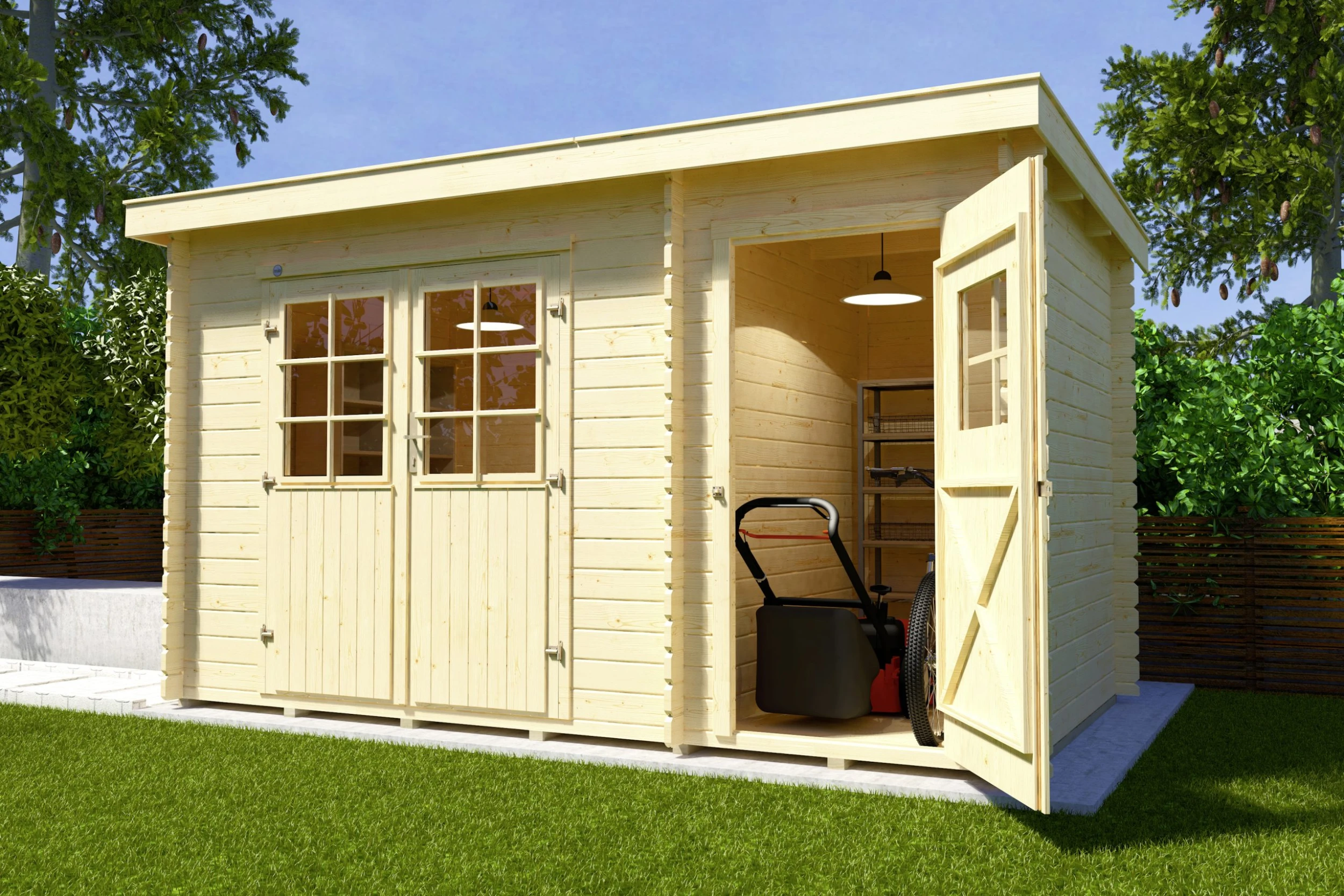 Gartenhaus Raine Gr. 1 mit Flachdach ist für alle geeignet, die Ihren Platz optimal nutzen wollen. Unser Raumwunder besteht aus einem großen Raum mit Massivholz-Doppeltür und einem Lagerraum mit Rahmen-Einzeltür. Ergänzt werden die Türen mit Lichtausschnitten aus Glas und Sprossen. Für Sicherheit und Funktionalität sorgt die hochwertige Drückergarnitur inklusive Profilzylinderschloss. Mit 370 cm Breite und 200 cm Höhe bietet es reichlich Platz. Ob Sie im Lagerraum Ihren Rasenmäher und Vertikutierer unterbringen, Sitzpolster verstauen oder ein Getränkelager einrichten – mit dem Gartenhaus Raine Gr. 1 haben Sie viele Möglichkeiten.